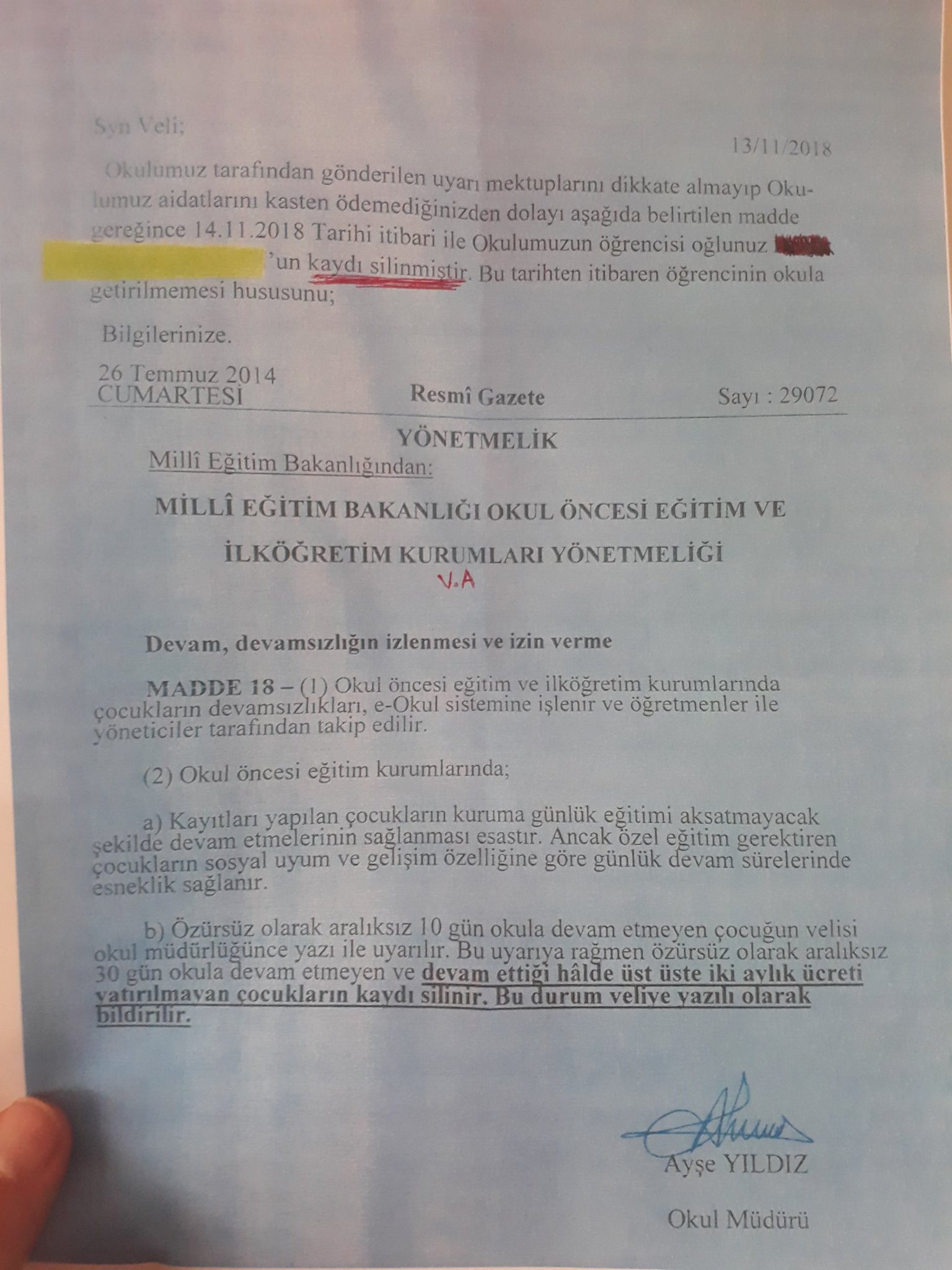 Ağbaba’nın paylaştığı belgede “Okulumuz tarafından gönderilen uyarı mektuplarını dikkate almayıp okulumuz aidatlarını kasten ödemediğinizden dolayı aşağıda belirtilen madde gereğince 14.11.2018 itibariyle okulumuzun öğrencisi oğlunuzun kaydı silinmiştir” ifadeleri kullanıldı.
