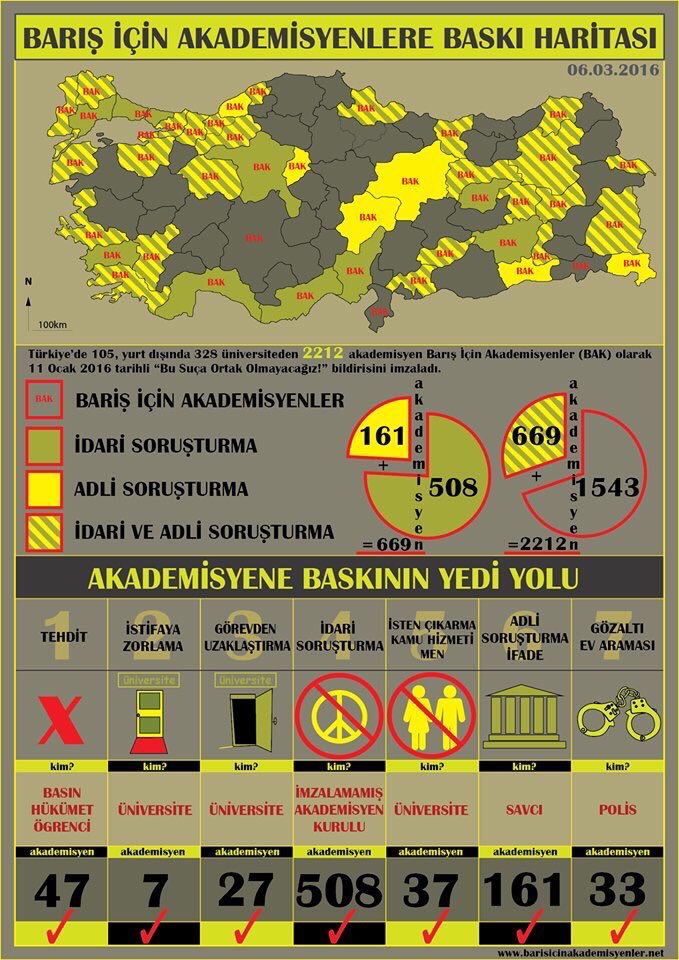 Ankara Cumhuriyet Başsavcılığı, Barış İçin Akademisyenler Grubu’nun imza metni ile ilgili Cumhurbaşkanı Recep Tayyip Erdoğan’ın açıklamalarından sonra soruşturma açmıştı. Ankara Başsavcılığı, İstanbul başta olmak üzere diğer bazı illerde “terör örgütüne yardım veya propaganda” kapsamında yapılan soruşturmaların aksine bildiri metninde terör suçu işlenmediği kanaatine vararak dosyayı Basın Savcılığı’na gönderdi. Basın Savcılığı da Türk Ceza Kanunu’nun 301. maddesinde düzenlenen “Türk milletini, Türkiye Cumhuriyetini ve TBMM’yi alenen aşağılama” suçundan 395 akademisyen hakkında soruşturma açabilmek için dosyayı Adalet Bakanlığı’na gönderdi. Bakanlıktan beklenin yanıt ise Bakan adına Ceza İşleri Genel Müdürlüğü Daire Başkanı hakim Şenol Taş’ın imzasıyla 7 Mart tarihinde gönderildi.