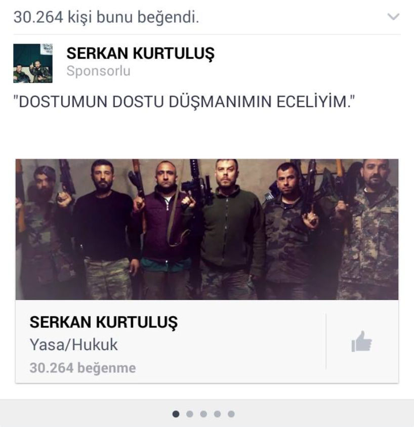 Suriye'de Türkmendağı'nda cihatçılarla beraber savaşan ve Türkiye tarafından düşürülen Rus uçağının pilotunu infaz ettiği için yargılanan ülkücü Alparslan Çelik'in yanındakiler çete kurdu, sosyal medyadan da propagandaya başladı. Facebook'ta kendi adına sayfa kuran Alparslan Çelik'in adamı Serkan Kurtuluş bir de üzerine Facebook'a reklam verdi. Serkan Kurtuluş'un sayfası "sponsorlu" duyurusuyla, kullanıcıların anasayfalarında çıkıyor.