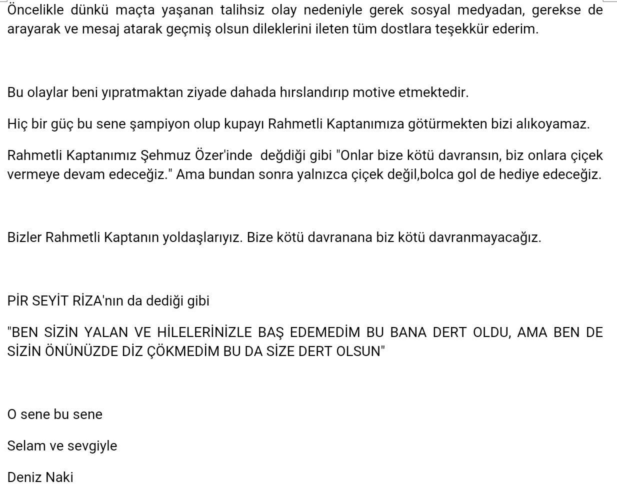 Mersin İdmanyurdu maçında yumruklu saldırıya uğrayan Amedspor kaptanı Deniz Naki, kişisel sosyal medya hesabından açıklamalarda bulundu. Naki, ‘Rahmetli kaptanımız Şehmuz Özer’in de dediği gibi,”Onlar bize kötü davransın, biz çiçek vermeye devam edeceğiz” diye yazdı.
