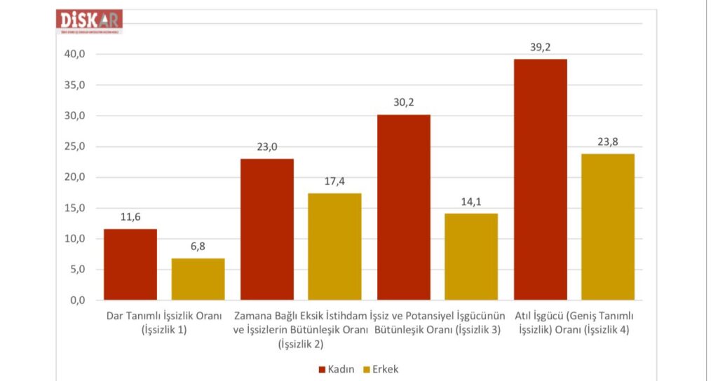 Rapor, kadın işsizliğinin erkeklere kıyasla çok daha yüksek seyrettiğini ortaya koydu. Geniş tanımlı kadın işsizlik oranı yüzde 39,2 olarak hesaplanırken, erkeklerde bu oran yüzde 23,8’de kaldı. Kadınlarda dar tanımlı işsiz sayısı 1 milyon 441 bin iken geniş tanımlı işsiz sayısı 6 milyon 230 bine ulaştı.