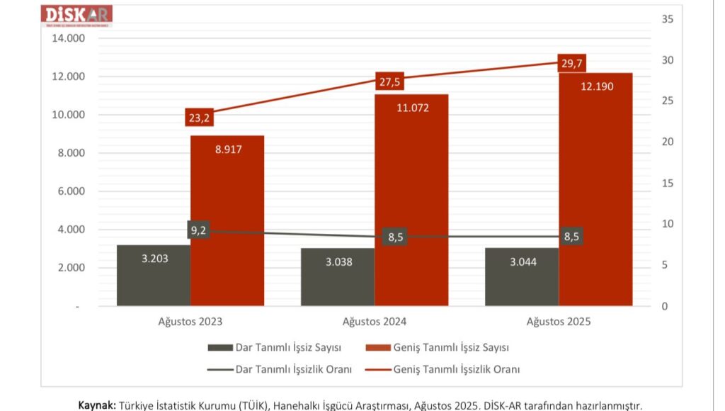 Türkiye Devrimci İşçi Sendikaları Konfederasyonu Araştırma Merkezi (DİSK-AR), TÜİK verilerinden yararlanarak hazırladığı “İşsizliğin Görünümü Eylül 2025” raporunu açıkladı. Rapora göre resmi işsizlik yüzde 8,5 görünürken, geniş tanımlı işsizlik oranı yüzde 29,7’ye yükseldi.