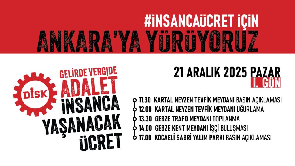Kartal’dan yola çıkan DİSK üyeleri, üç gün sürecek yürüyüş kapsamında çeşitli kent ve ilçelerde duraklayarak basın açıklamaları yapacak. Yürüyüşün 23 Aralık’ta Ankara’da sona ermesi planlanıyor.