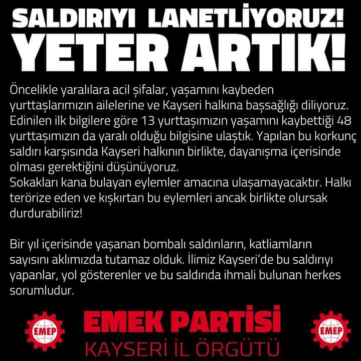 Kayseri'de yaşanan patlama sonrasında HDP, CHP, DİSK ve EMEP Kayseri il binalarına yapılan provakatif saldırılar sonrası EMEP İl Örgütü bir metin yayınlamıştı.
