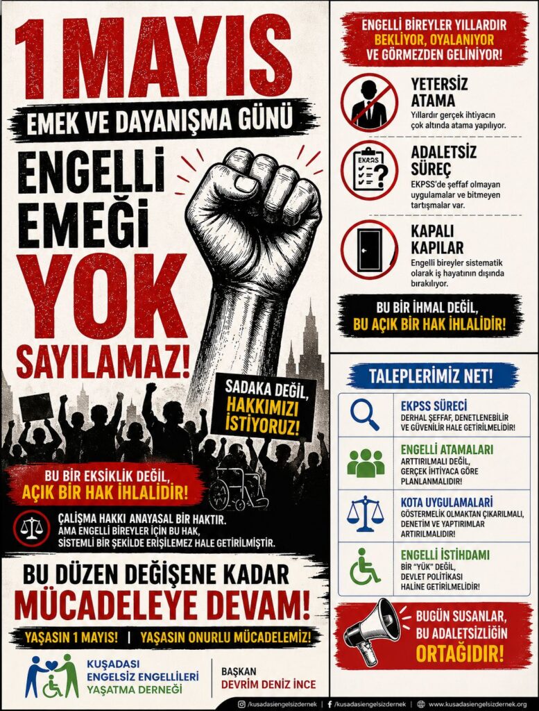 Kuşadası merkezli Engelsiz Engelliler Derneği, 1 Mayıs Emek ve Dayanışma Günü öncesinde Türkiye genelindeki engelli istihdam politikalarını masaya yatırdı. EKPSS’deki şeffaflık sorunlarından, özel sektördeki kota ihlallerine kadar pek çok alanda sert eleştirilerde bulunan dernek, "Engelli emeğinin yok sayılmasına artık yeter" diyerek hükümete ve iş dünyasına çağrıda bulundu.
