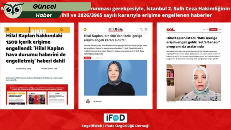 İfade Özgürlüğü Derneği (İFÖD) sitesinde yer alan EngelliWeb sayfasının erişime engellenen haberine göre Sabah Gazetesi yazarı Hilal Kaplan’ın yazıları hakkında yapılan haberler, kişilik hakları ihlali gerekçesiyle, daha önce İstanbul 6. Sulh Ceza Hakimliğinin 14 Nisan 2023 tarih ve 2023/3431 sayılı, İstanbul Anadolu 10. Sulh Ceza Hakimliğinin 24 Ekim 2023 tarihli ve 2023/9519 sayılı ve İstanbul 8. Sulh Ceza Hakimliğinin 13 Kasım 2025 tarihli ve 2025/11603 sayılı kararlarıyla erişime engellenmişti. Son kararın EngelliWeb’de duyurulmasına da İstanbul 2. Sulh Ceza Hakimliğinin 28 Nisan 2026 tarihli ve 2026/3965 sayılı kararıyla erişim engeli getirildi ve haberin silinmesine hükmedildi. EngelliWeb haberi “XXXXX XXXXXX hakkındaki haberler ve sosyal medya paylaşımları” başlığıyla verdi.