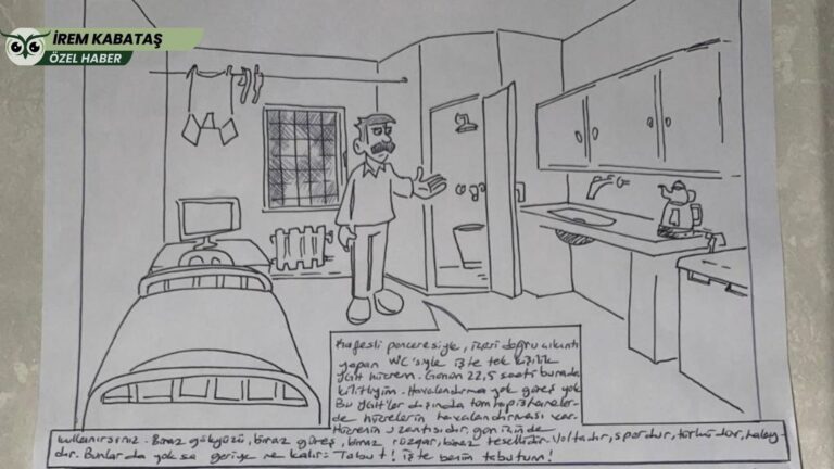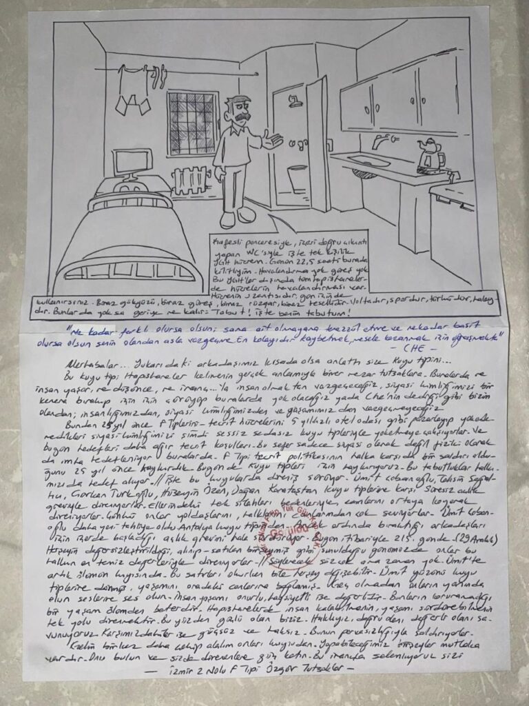 Mektupta yer alan çizim ve metin, F Tipi hapishanedeki tek kişilik hücrenin nasıl bir yaşam alanına dönüştüğünü gözler önüne seriyor. Tutsak, kendi kaldığı hücreyi şu sözlerle anlatıyor: