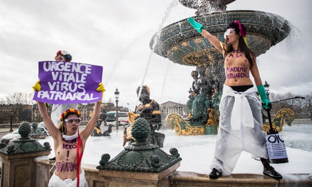 Bu sabah üstsüz bir şekilde Paris'in ikonik Concorde Meydanı'nda toplanan FEMEN üyeleri, Vücutlarına yazdıkları sloganlarla bütün kadınları "Patriyarkal salgını durdurmaya" ve "patriyarka virüsünü" yoketmeye çağırdı.