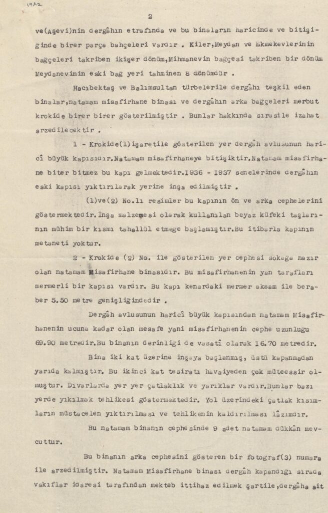2 – Krokide (2) No. ile gösterilen yer cephesi sokağa nazır olan natamam Misafirhane binasıdır. Bu misafirhanenin yan tarafları mermerli bir kapısı vardır. Bu kapı kenardaki mermer aksam ile beraber 5. 50 metre genişliğindedir.