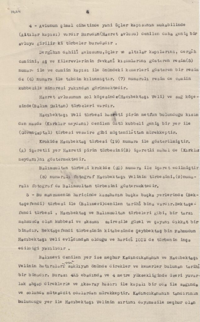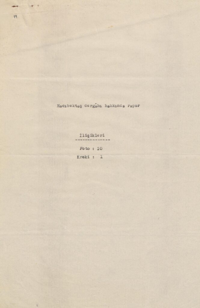 “Hacıbektaş dergâhı ile müştemilâtına ait olan işbu rapor, temas eylediği mevzuun hususiyetine binaen, Kırşehir idaresi dahilindeki tetkiklerim netayicini ihtiva eyleyen diğer idarî raporlardan tefrik edilerek 10 kıt’a fotoğraf ve bir kroki ile birlikte ayrıca tanzim ve yüksek huzurlarına takdim kılınmıştır.
