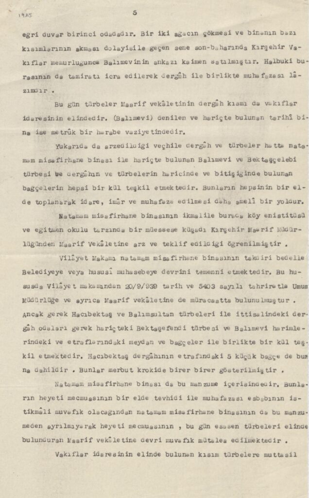 Vilâyet Makamı natamam misafirhane binasının takdiri bedelle Belediyeye veya hususî muhasebeye devrini temenni etmektedir. Bu hususda Vilâyet makamından 20/ 9/ 939 tarih ve 5403 sayılı tahriratla Umum Müdürlüğe ve ayrıca Maarif vekâletine de müracaatta bulunulmuştur. Ancak gerek Hacıbektaş ve Balımsultan türbeleri ile ittisalindeki dergâh odaları gerek hariçteki Bektaşefendi türbesi ve Balımevi harimlerindeki ve etraflarındaki meydan ve bağçeler ile birlikte bir kül teşkil etmektedir. Hacıbektaş dergâhının etrafındaki 5 küçük bağçe de buna dahildir. Bunlar merbut krokide birer birer gösterilmiştir.