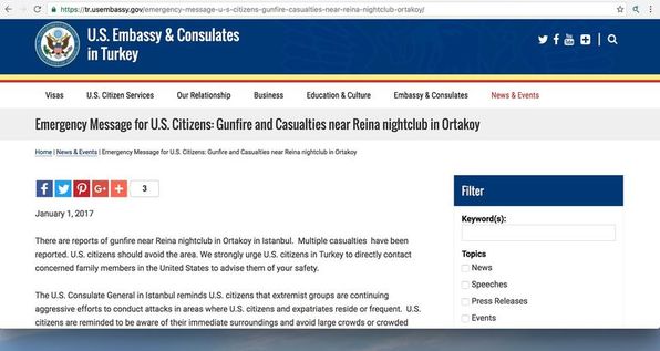 Saldırının ardından ABD Dışişleri Bakanlığı, yeni yılın ilk gününde yazılı bir açıklama yaparak, Türkiye'de yaşayan Amerikan vatandaşlarını uyardı.