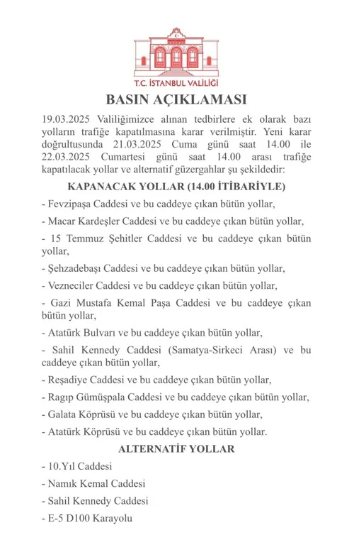 Share Facebook Twitter LinkedIn Pinterest Email İstanbul Valiliği, yarın saat 14.00’a kadar bazı yolların trafiğe kapatılacağını bildirdi.