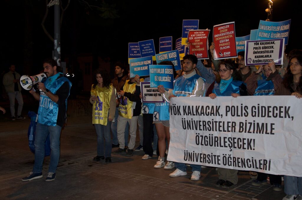 “YÖK kalkacak, polis gidecek, üniversiteler bizimle özgürleşecek” sloganlarının yankılandığı eylemde öğrenciler, 1980 darbesinin ardından kurulan YÖK’ün 44 yıldır üniversitelerde baskı ve sermaye denetimini sürdürdüğünü belirtti.