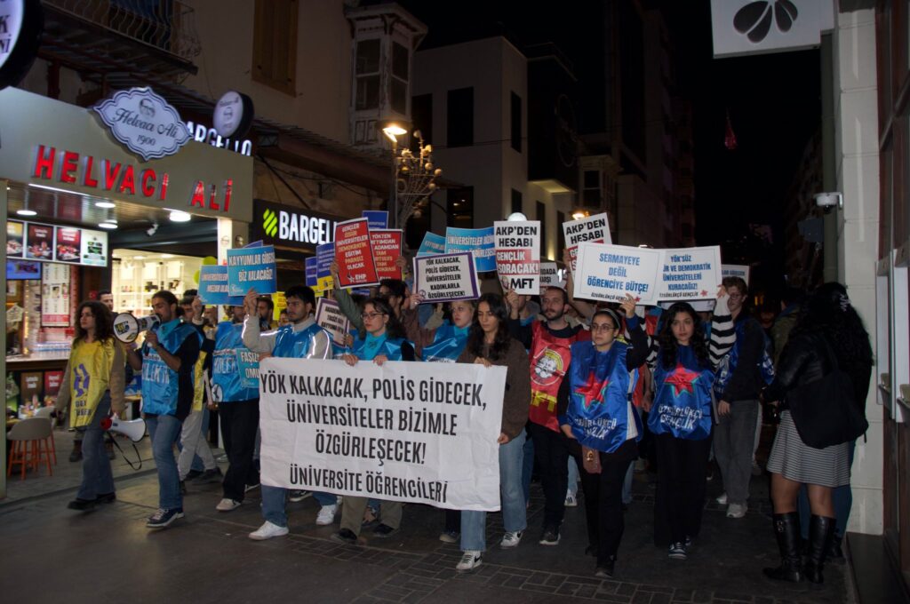İzmirli üniversiteliler, Yükseköğretim Kurulu’nun (YÖK) kuruluş yıl dönümünde Alsancak ÖSYM binası önünde toplandı. Ellerinde pankart ve dövizlerle yürüyüşe geçen öğrenciler, kısa bir yürüyüşün ardından Dokuz Eylül Üniversitesi Rektörlüğü önünde basın açıklaması gerçekleştirdi.