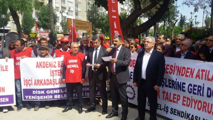 Genel-İş Genel Başkanı Remzi Çalışkan açıklamasında, “Binlerce kamu çalışanı ile birlikte belediyelerde, belediye şirketlerinde ve belediyelerdeki taşeron şirketlerde çalışan binlerce işçinin iş akitleri feshedildi ya da askıya alındı. En son Mersin Akdeniz Belediyesi’nde taşeron şirketlerinden 100 üyemiz işten çıkarıldı” dedi.