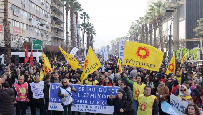 Konak’tan SGK binasına yürüyen kamu emekçileri, emekçiler arası dayanışmanın büyütülmesi gerektiğini vurguladı.