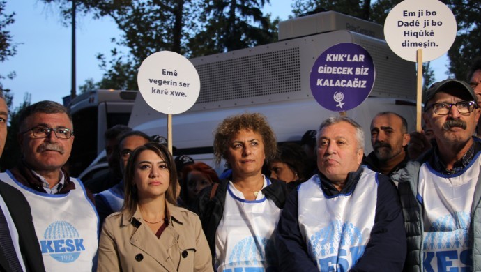 KESK Eş Genel Başkanı Ayfer Koçak ise KHK’lerin sadece bir hukuksuzluk aracı değil, aynı zamanda barış talebine yönelik bir saldırı olduğunu söyledi: