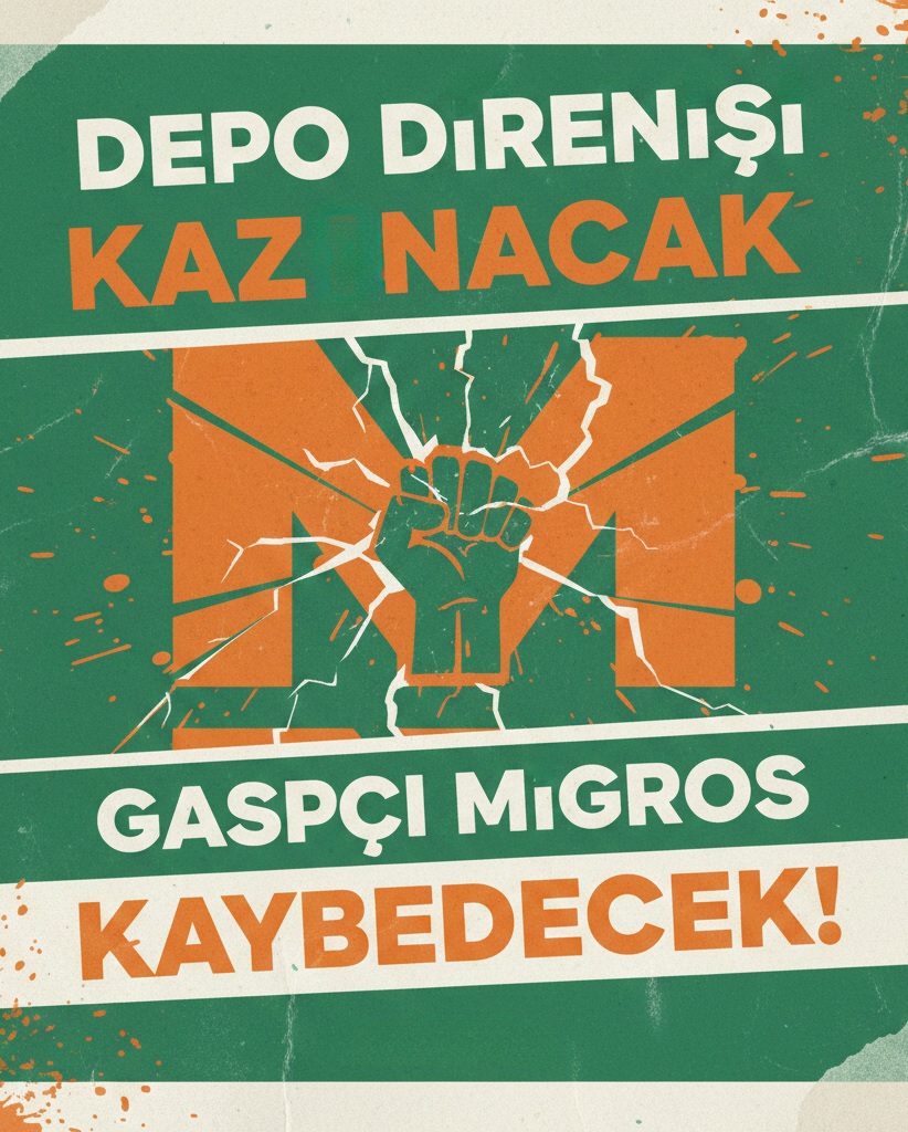 “Migros’tan BİM’e, depolarda sefalet koşullarına karşı sesleniyoruz! Depo direnişleri kazanacak, gaspçı patronlar kaybedecek! #MigrostaSefaleteHayır #GaspcıMigros “