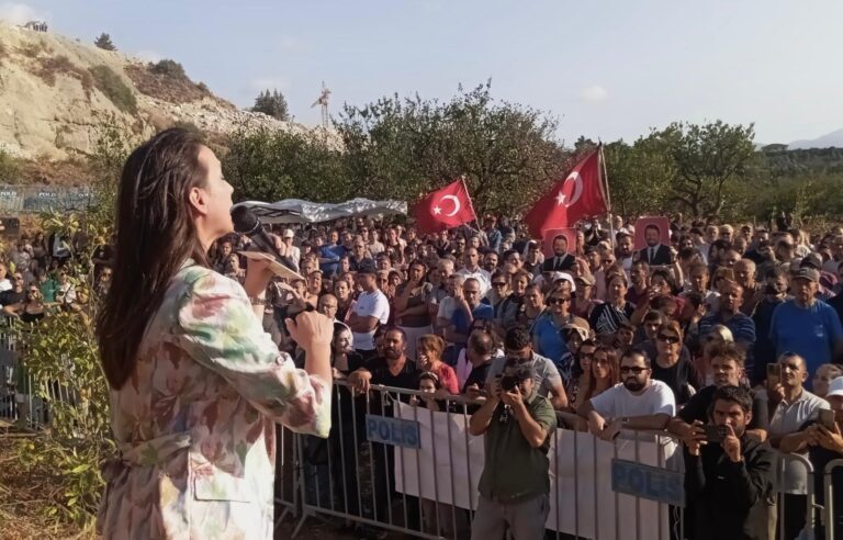 Zeytinliklerin, narenciye bahçelerinin ve tarım arazilerinin “yeniden inşa” gerekçesiyle ellerinden alınmasına karşı yapılan miting, TOKİ’nin 5. etap projesi için kamulaştırılan alanda gerçekleştirildi. Köylüler bahçelerin arasından yürüyerek miting alanına ulaştı.