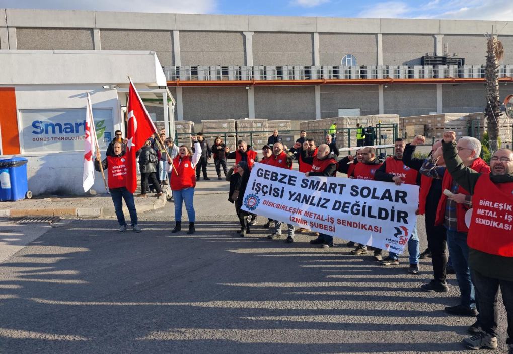 İzmir Aliağa’daki Smart Solar fabrikası önünde de Birleşik Metal-İş İzmir Şubesi, siyasi partiler ve demokratik kitle örgütlerinin katılımıyla bir eylem gerçekleştirildi. Eylem, Smart Solar patronunun geçmişte İzmir fabrikasında işkolu değişikliği yoluyla sendikal yetkiyi engelleyen uygulamalarını da yeniden gündeme taşıdı.