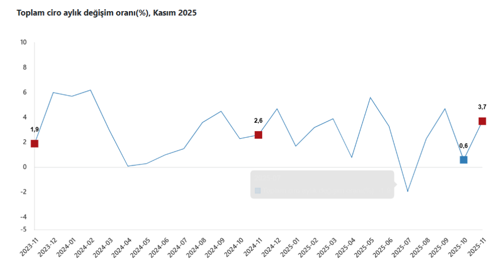 Türkiye İstatistik Kurumu’nun (TÜİK) Kasım 2025 Ciro Endeksleri verileri, sanayi, inşaat, ticaret ve hizmet sektörlerinde toplam cironun yıllık yüzde 37,3 oranında arttığını ortaya koydu.