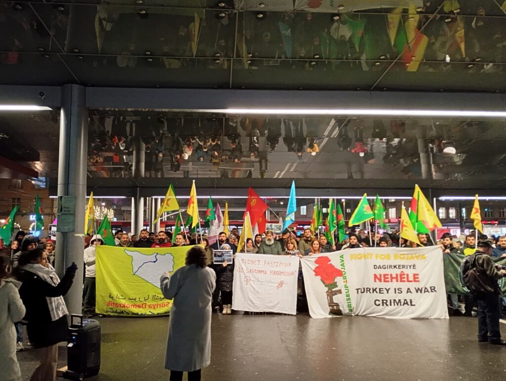Hamburg’da Sternschanze Tren İstasyonu’nda düzenlenen basın açıklamasında, Şeyh Maksud ve Eşrefiye mahallelerine yönelik saldırılar protesto edildi. Yapılan konuşmalarda Avrupa’daki dayanışmanın büyütülmesi çağrısı yapıldı.