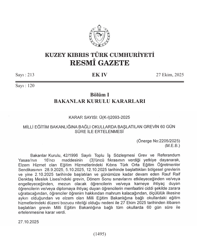 Bakanlar Kurulu’nun dün Resmî Gazete’de yayımlanan kararıyla öğretmenlerin başlattığı grev 60 gün süreyle ertelenmesi üzerine KTÖS Yönetim Kurulu adına yazılı açıklama yapan Eylem, Bakanlar Kurulu’nun defalarca Anayasa’ya aykırı kararlar aldığını ve bu kararların Anayasa Mahkemesi’nden döndüğünü belirterek, grev ve eylem haklarına yönelik saldırı kararını tanımadıklarını belirtti. Eylem, öğretmenlerin bugün saat 12.00’da Başbakanlık ışıklarında toplanarak Başbakanlık önüne yürüyeceklerini de duyurdu.