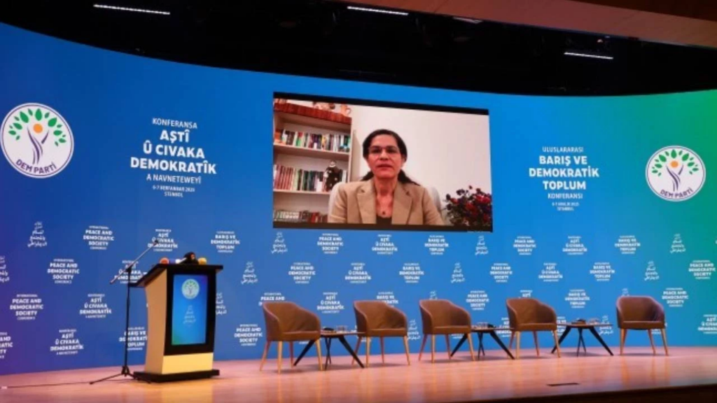 Kuzey ve Doğu Suriye Özerk Yönetimi Dış İlişkiler Dairesi Başkanı İlham Ahmed zoom bağlantısıyla konferansta bir konuşma yaptı. Uluslararası Barış ve Demokratik Toplum Konferansı’nda konuşan İlham Ahmed, “Türkiye’yle diyalog içinde olmak istiyoruz. Sınırlarımız açılsın. Türkiye’deki barış sürecinin nihayete ermesini istiyoruz” dedi.
