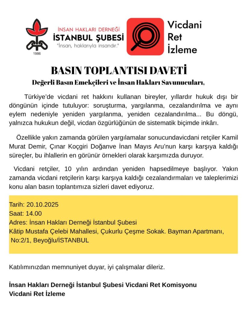 İHD İstanbul Şubesi Vicdani Ret Komisyonu ve Vicdani Ret İzleme tarafından yapılan açıklamada, son dönemde görülen davalar sonucunda vicdani retçiler Kamil Murat Demir, Çınar Koçgiri Doğan ve İnan Mayıs Aru’nun yeniden yargılanmasının, bu hak ihlallerinin en görünür örneklerinden biri olduğu vurgulandı.