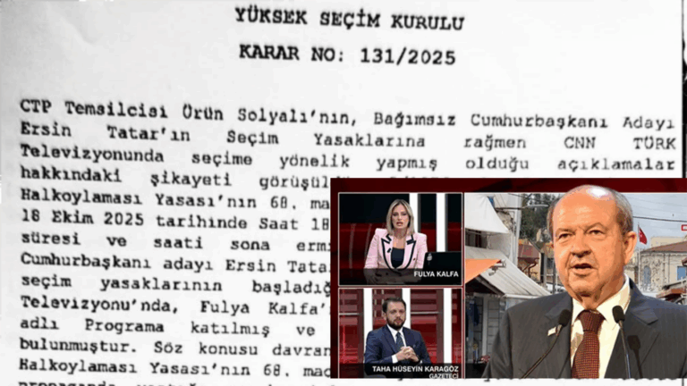 YSK’nın 131/2025 sayılı kararına göre, CTP Temsilcisi Ürün Solyalı tarafından yapılan şikâyet üzerine toplanan kurul, Tatar’ın 18 Ekim 2025 tarihinde saat 18.00’de sona eren propaganda süresinin ardından CNN Türk televizyonunda yayımlanan “CNN Türk Masası” adlı programa katıldığını tespit etti.